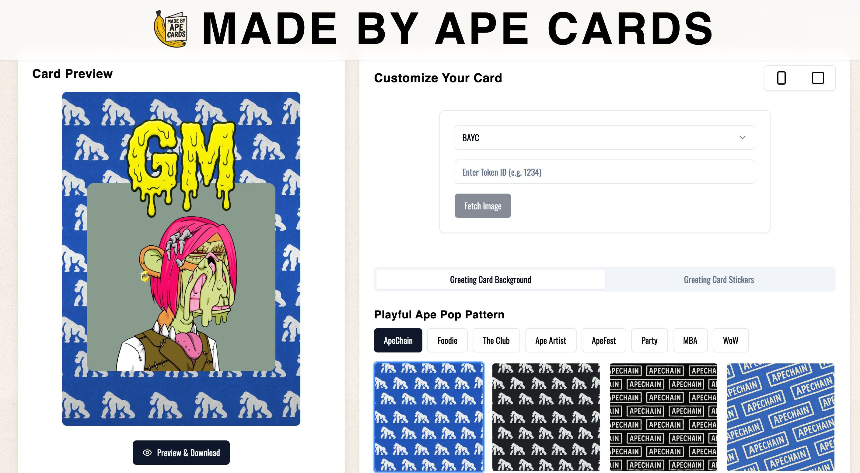Customize your own NFT-powered greeting cardsโstraight from the swamp to your frens. Featuring collections like BAYC, MAYC, BAKC, WoW and more. Designed by BoredArt, powered by Made by Ape Cards.๐จ Drag, drop, dress up your Ape๐ Send IRL or download & share๐ฅ For birthdays, GMs, and pure degen joyBecause apes have feelings too.